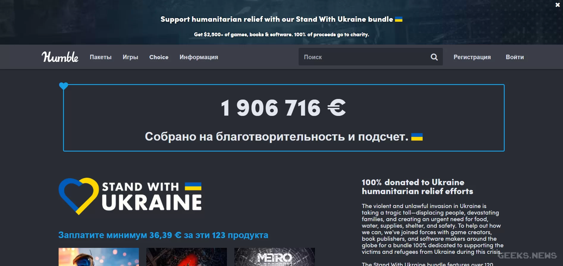 Компанія Humble Bundle вирішила також допомогти Україні. Був сформований унікальний бандл (збірка ігор), при покупці якого сервіс переказую 100% коштів на гуманітарну допомогу Україні.