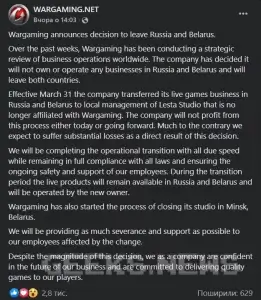 За останні тижні Wargaming провела стратегічний огляд бізнес-операцій у всьому світі. Компанія вирішила, що не володітиме або керуватиме бізнесом в Росії та Білорусі і залишить обидві країни. З 31 березня компанія передала свій ігровий бізнес у Росії та Білорусі під місцеве управління Lesta Studio, яка більше не афілійована з Wargaming. Компанія не отримає прибуток від цього процесу ні сьогодні, ні в майбутньому. Навпаки, ми очікуємо на значні збитки в результаті цього рішення.