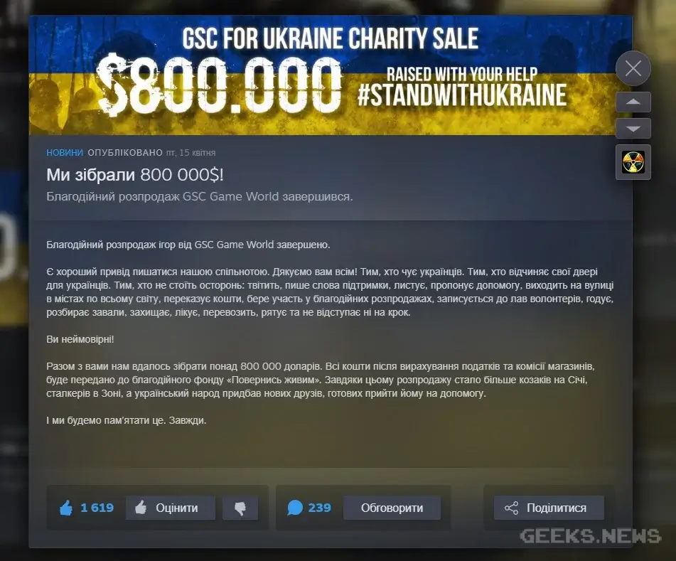 GSC Game World відзвітувались про результат свого благодійного розпродажу, який вони проводили з 4-го по 11-те квітня 2022 року. Як заявили в компанії, їм вдалось зібрати понад 800 000 доларів, з яких компанії та магазини вирахують податки та комісії, а решта піде на потреби фонду «Повернись живим».