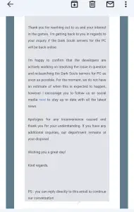 Я радий підтвердити, що розробники активно працюють над вирішенням цієї проблеми та якнайшвидшим повторним запуском серверів Dark Souls для ПК. На даний момент ми не маємо оцінки, коли це відбудеться».