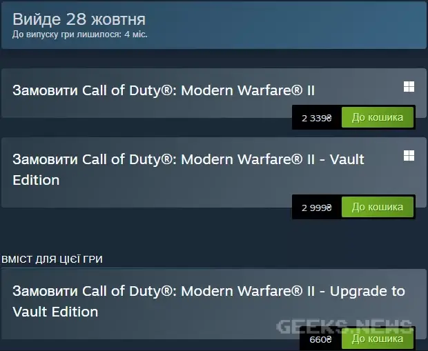 Вихід Call of Duty®: Modern Warfare® II запланований на 28 жовтня 2022 року. Вона уже доступна для попереднього замовлення в Steam.