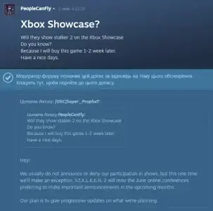 Була надія, що розробники дадуть свою відповідь саме на виставці Xbox Showcase та продемонструють реальний технічний стан гри, адже навіть давніші трейлери показували, що поступ у їх роботі є і він значний. Але у відповідь на запитання, поставлене на формі в Steam, один з модераторів відповів, що розробники вирішили пропустити усі презентації, які відбудуться в червні. Натомість вони трохи пізніше оприлюднять певні новини, які і пролиють світло на актуальний стан гри.