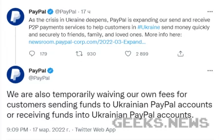 Платіжна система PayPal не стояла осторонь та засудила окупаційну війну рф проти України. Також, зі своєї сторони сервіс зробив низку рішень, спрямованих на допомогу Україні.