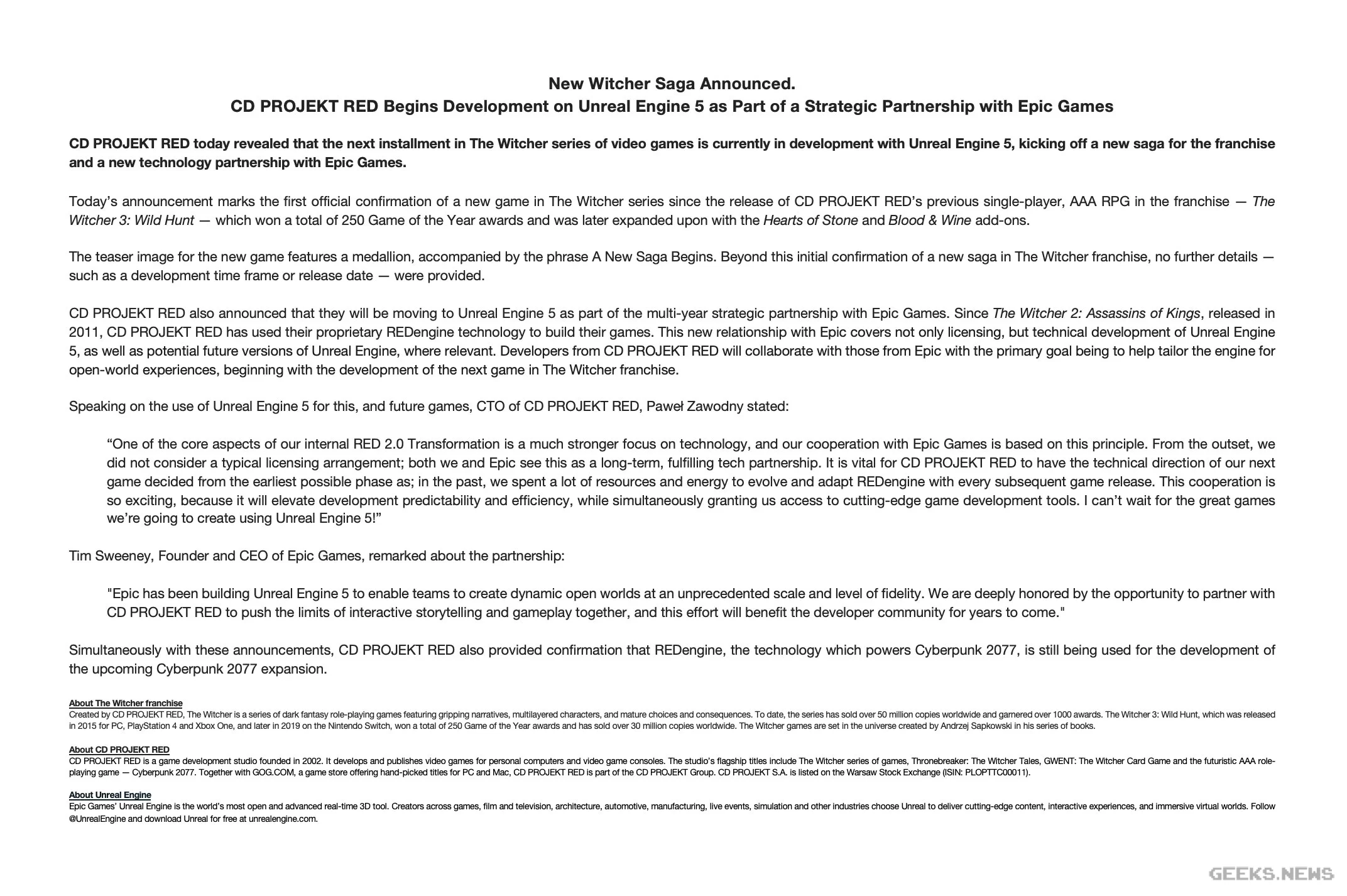 Для CD PROJEKT RED життєво важливо, щоб технічний напрямок нашої наступної гри був визначений з самого раннього етапу, оскільки у минулому ми витрачали багато ресурсів та енергії на розвиток та адаптацію REDengine з кожним наступним релізом гри. Ця співпраця дуже цікава, оскільки підвищить передбачуваність та ефективність розробки, водночас надавши нам доступ до найсучасніших інструментів розробки ігор. Я не можу дочекатися чудових ігор, які ми збираємося створювати за допомогою Unreal Engine 5!