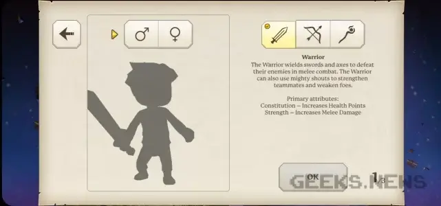 Для початку, ми обираємо стать, опісля - клас. Все досить просто: воїн для ближнього стримування ворогів, маг для дальнього, а ось лучник може комбінувати ці дві можливості на своє уподобання. Але тсс, я вам цього не казав 🙂