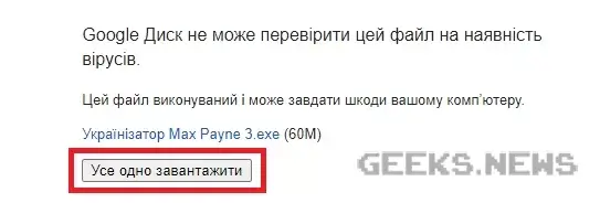 Оскільки файл занадто великий, щоб Google міг перевірити його на віруси, вас про це попередять і потрібно натиснути кнопку Усе одно завантажити.