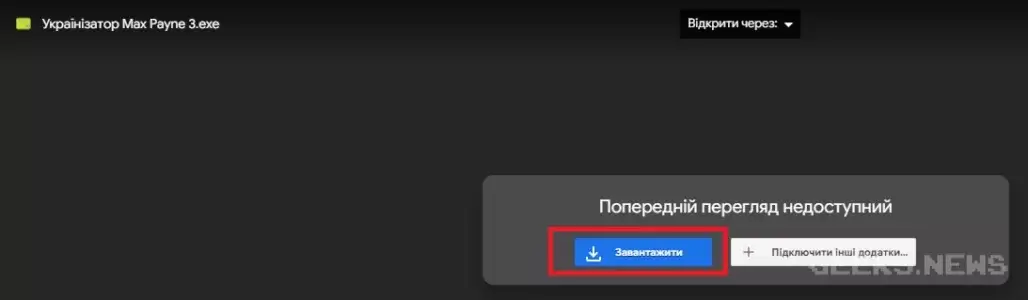 Українізатор Max Payne 3 знаходиться на Google Диску, звідки його потрібно завантажити. У вікні Попередній перегляд недоступний потрібно натиснути кнопку Завантажити.