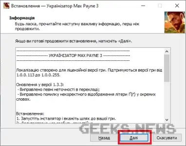 Наступне вікно слід уважно прочитати. У ньому написано про те, на яких версіях гри працюватиме українізатор, та які виправлення було зроблено в останній версії. Після прочитання натисніть Далі.