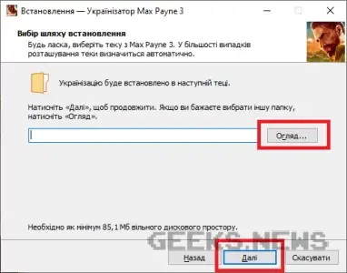 Якщо ж у вас шлях автоматично не підтягнувся, потрібно його вказати вручну. Якщо ви не знаєте, де розташована гра, спробуйте заново запустити інсталятор гри і поглянути, який шлях він запропонує. Якщо ж у вас Steam версія, то шлях можна переглянути у властивостях гри.