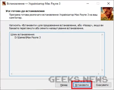 Після того, як ви вказали шлях та натиснули далі, вам необхідно натиснути кнопку Встановити.