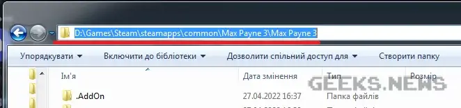 Відкриється провідник, у якому і буде показано шлях до файлів гри, який потрібно скопіювати.