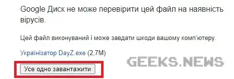 Як завжди, Google не може перевірити файл на віруси, тому рапортує про це, а ми тиснемо кнопку Усе одно завантажити.