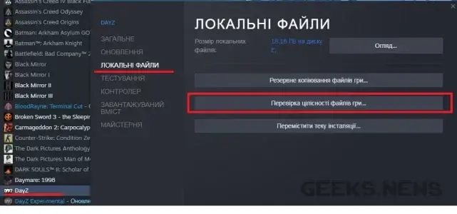 Для цього потрібно знову зайти в бібліотеку Steam, викликати меню властивостей гри, як було описано вище і в пункті Локальні файли натиснути Перевірка цілісності файлів гри.