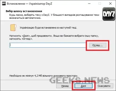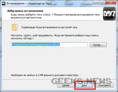 У наступному вікні потрібно вказати шлях до гри. Зазвичай цей процес відбувається автоматично і робити нічого не потрібно. Якщо ж шлях до гри не підтягнувся, тиснемо кнопку Огляд, та вказуємо шлях.