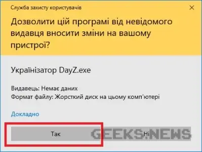 Дозволяємо файлу вносити зміни на вашому комп'ютері, щоб він мав змогу замінити файли локалізації на українську. Для цього тиснемо Так.