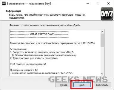 В наступному вікні ви можете отримати усю необхідну інформацію, щодо покращень локалізації, виправлень, авторів українізатора тощо. Після ознайомлення тиснемо Далі.