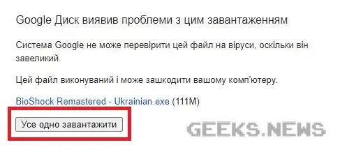 Після цього отримуємо звичне сповіщення від Гугла, про неможливість перевірити файл на віруси (у файлі вірусів немає). Тиснемо кнопку Усе одно завантажити.
