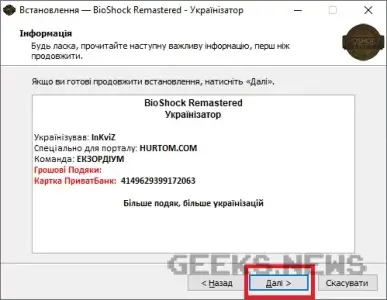 Після цього відкриється вікно з інформацією про авторів, та їх підтримку. Ознайомившись знову тиснемо Далі.