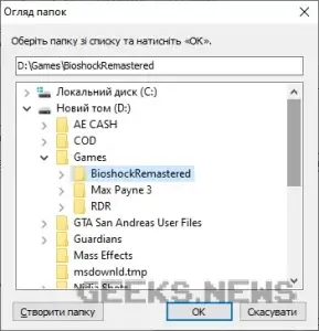 В наступному вікні потрібно вибрати шлях до гри. Ним буде той шлях, за яким ви встановлювали гру в Epic Games Store або Steam. У версії Steam э можливість переглянути цей шлях через бібліотеку ігор. Для цього потрібно знайти в бібліотеці встановлений BioShock Remastered та кликнути по ньому правою кнопкою миші. В контекстному меню вибрати пункт Властивості. У вікні, яке відкрилось вибрати пункт Локальні файли та натиснути кнопку Огляд. Після цього відкриється провідник, з якого ви зможете скопіювати шлях до гри та вставити його в інсталятор.