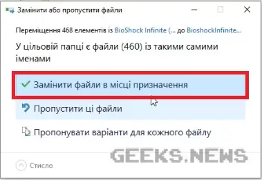 В модальному вікні вибираємо пункт Замінити файли в місці призначення.