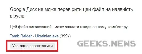 З Google диска завантажиться файл Tomb Raider - Ukrainian.exe.