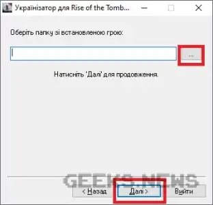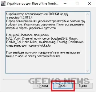 Після вибору тиснемо Далі. Відбудеться перевірка можливості встановлення локалізації, де потрібно підтвердити встановлення українізатора. Після цього все виконається автоматично. Закриваємо інсталятор, та насолоджуємося грою Українською.