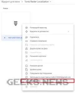 Завантажуємо архів з українізатором з Google Диску. Тиснемо правою клавішею миші по файлу та натискаємо кнопку Завантажити.![]()
