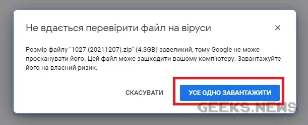 Google попередить, що не може перевірити файл, тому натискаємо Усе одно завантажити.