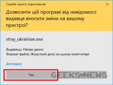Windows або антивірус можуть "сваритися" на цей файл, але це нормально. Просто прослідкуйте, щоб він був доданий у винятки (або білий список), а його запуск дозволений вашим антивірусом. Відкриється війно, у якому потрібно натиснути Так.