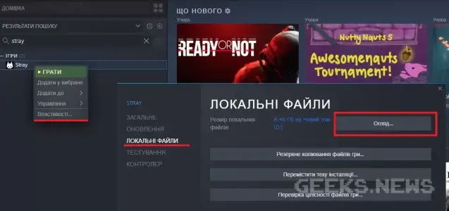 Якщо ви не знаєте, де знаходиться гра, зайдіть у Steam, знайдіть Stray в бібліотеці та натисніть на неї правою кнопкою миші. У контекстному меню виберіть пункт Властивості. У вікні, яке відкриється виберіть розділ Локальні файли, та натисніть на кнопку Огляд.