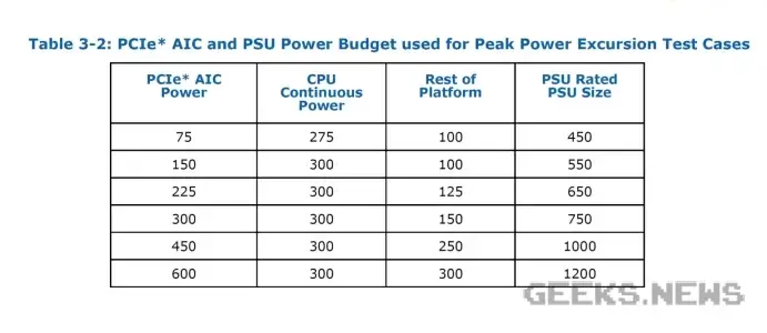 (У першому стовпчику споживання відеокарти, у другому максимальне споживання процесора, третій стовпчик показує споживання, відведене іншим комплектуючим ПК, а четвертий показує рекомендовану потужність БЖ ATX 3.0.)