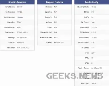 У порівнянні з попередником GA100 (7 нанометрів, площа кристала 826 мм2) новий GH100 має меншу площу 814 мм² і при цьому кількість транзисторів новинки є майже на 50% більшою та становить 80 млрд, за рахунок меншого техпроцесу 4 нм.