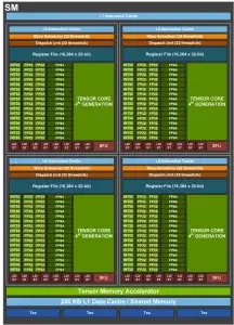 Сама ієрархія компонентів GH100 схожа до минулого покоління: 144 мультиплексора SM, 18 432 ядра FP32 CUDA і 9 216 ядер CUDA подвійної точності (FP64). Також чіп включає 576 Тензорних ядер четвертого покоління. Один з GPC має апаратне забезпечення растрової графіки, завдяки йому чіп може виконувати завдання GPU(відеоадаптера).
